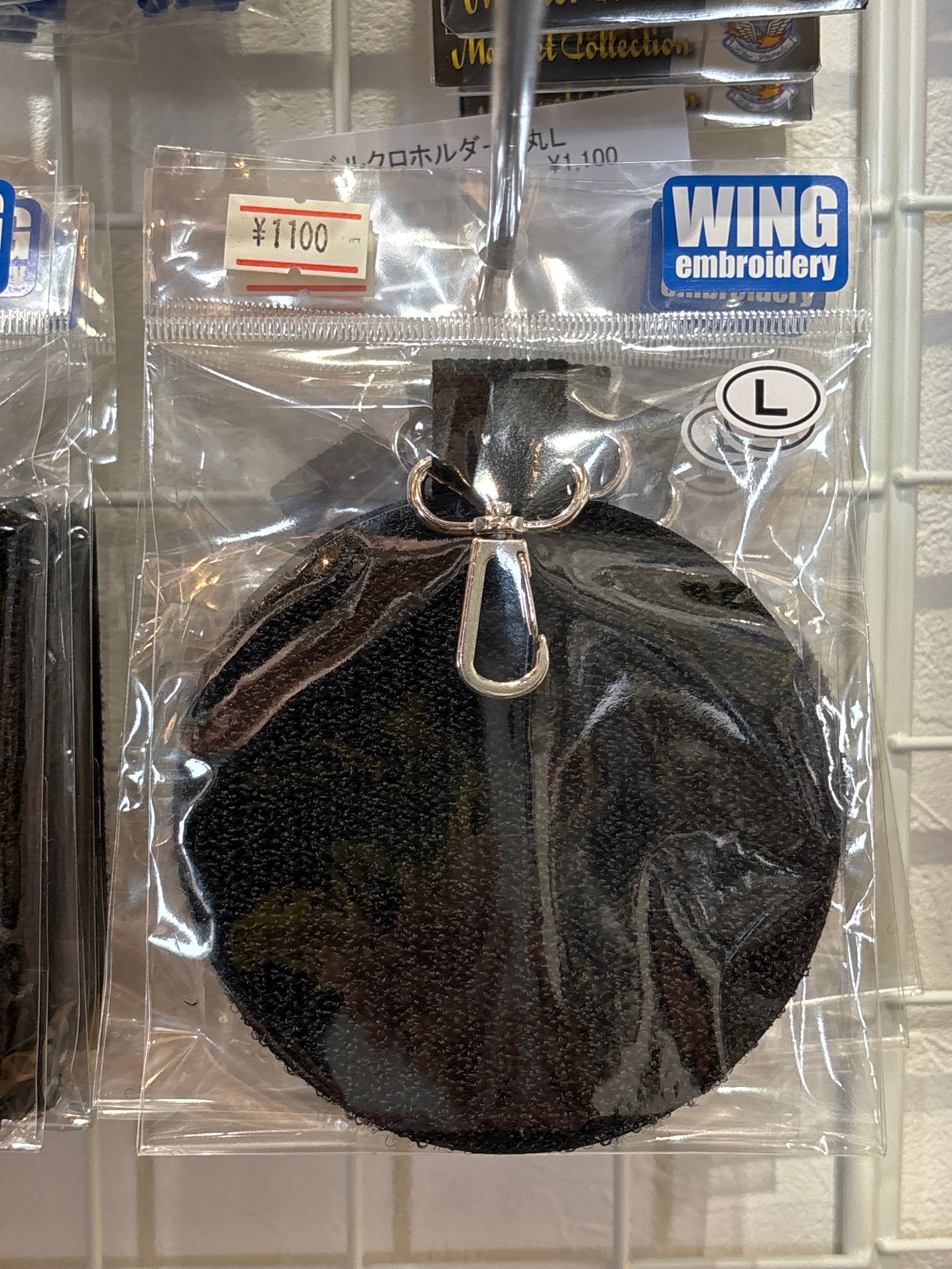 ウィング刺繍製 両面にベルクロがあり、パッチをキーホルダーのようにぶら下げられる。